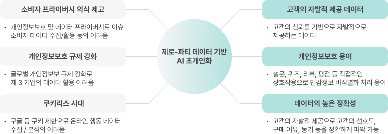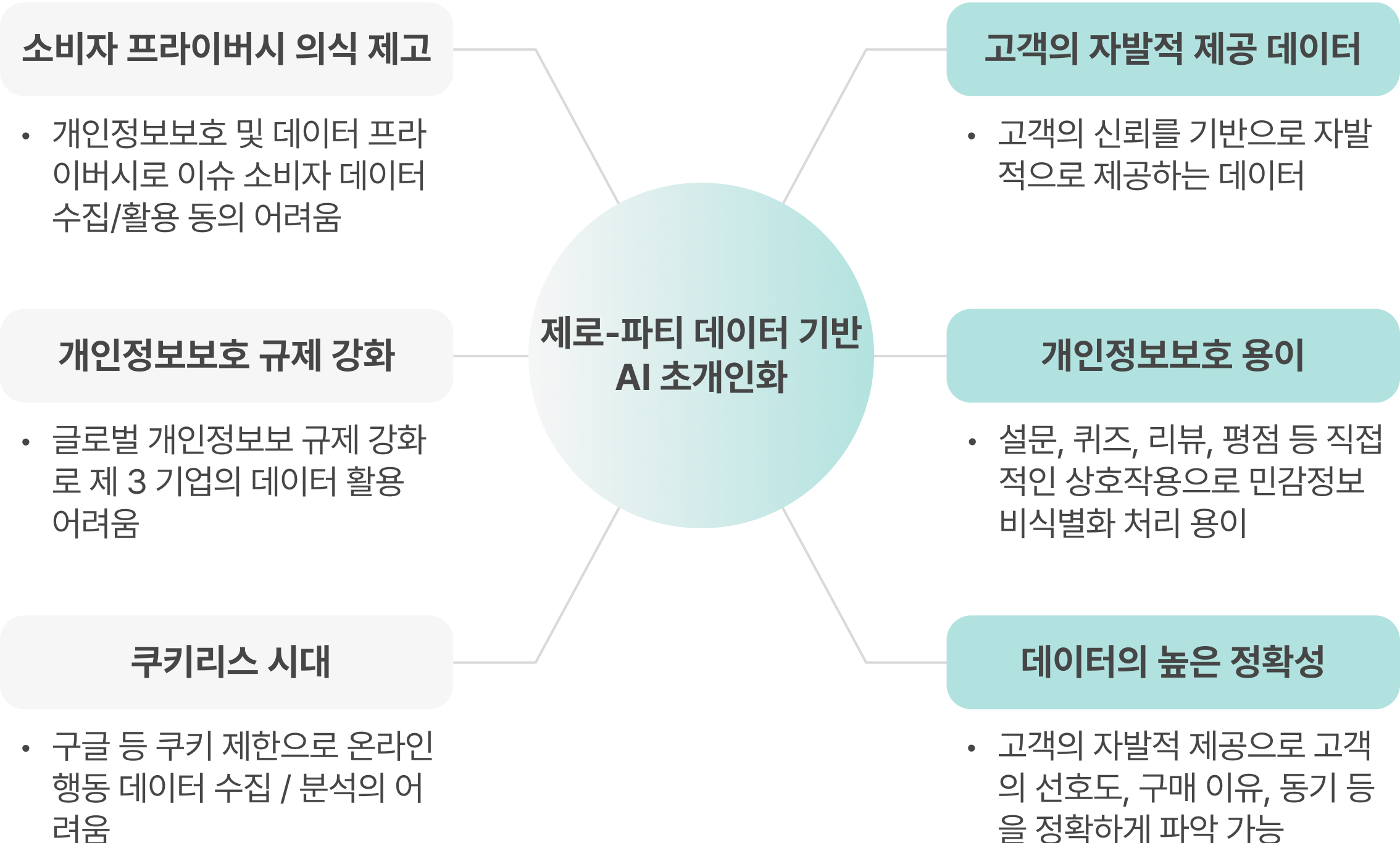 최근 AI를 중심으로 한 산업환경의 변화로 기업의 전략 수립과 마케팅 의사 결정 과정에 있어 데이터의 중요성이 더욱 높아지고 있습니다. 특히 제로-파티 데이터 기반 AI 초개인화는 고객이 자발적으로 제공하는 데이터이므로 설문, 퀴즈 리뷰, 평점 등 직접적인 상호작용을 통해 민감정보 비식별화 처리가 용이하고 고객의 선호도와 구매 이유, 동기 등을 정확하게 파악할 수 있다는 점에서 마케팅의 핵심 요소라고 할 수 있습니다.