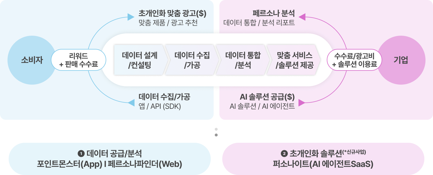 ❹ 퍼소나이트는 제로-파티 데이터 기반의 초개인화 마케팅 AI 솔루션으로 사용자의 구매 행동, 설문 데이터, 실시간 대화를 분석하여 최적화된 상품을 추천하며, 하이퍼-퍼소나 및 멀티 에이전트 시스템을 활용하여 개별 고객의 니즈를 정밀하여 파악하고 맞춤형 메시지를 제공하여 구매 전환율을 극대화합니다. 즉, 개개인의 고객에게는 광고가 아닌 유익한 정보를 제공하고 기업에게는 의미있는 진짜 고객을 연결합니다. 또한 기존 고객 데이터를 분석하는 것 뿐만 아니라 제로파티 데이터(직접 입력한 정보)와 AI 챗봇(Selyn AI)을 활용한 실시간 데이터를 반영하여 고객의 특성과 필요에 맞춘 메시지를 자동으로 생성하여 개인화된 경험을 제공합니다. 퍼소나이트는 B2C 서비스인 포인트 몬스터로 고객을 유입시키고 이곳에서 수집·생산한 데이터를 AI로 가공·분석하여 B2B 서비스인 페르소나 파인더에 쌓여 활용하는 최종의 모델이라고 할 수 있습니다.