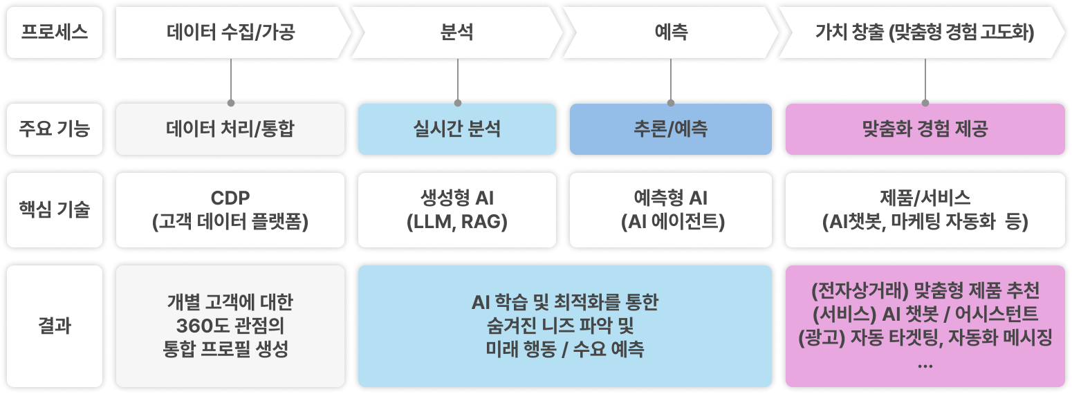 방대한 고객 데이터를 분석하여 고객이 원하는 제품이나 콘텐츠를 정확히 제공하고 나아가 고객이 인지하지 못한 숨겨진 니즈까지 충족시켜 사용자 경험을 고도화 하는 것을 말함