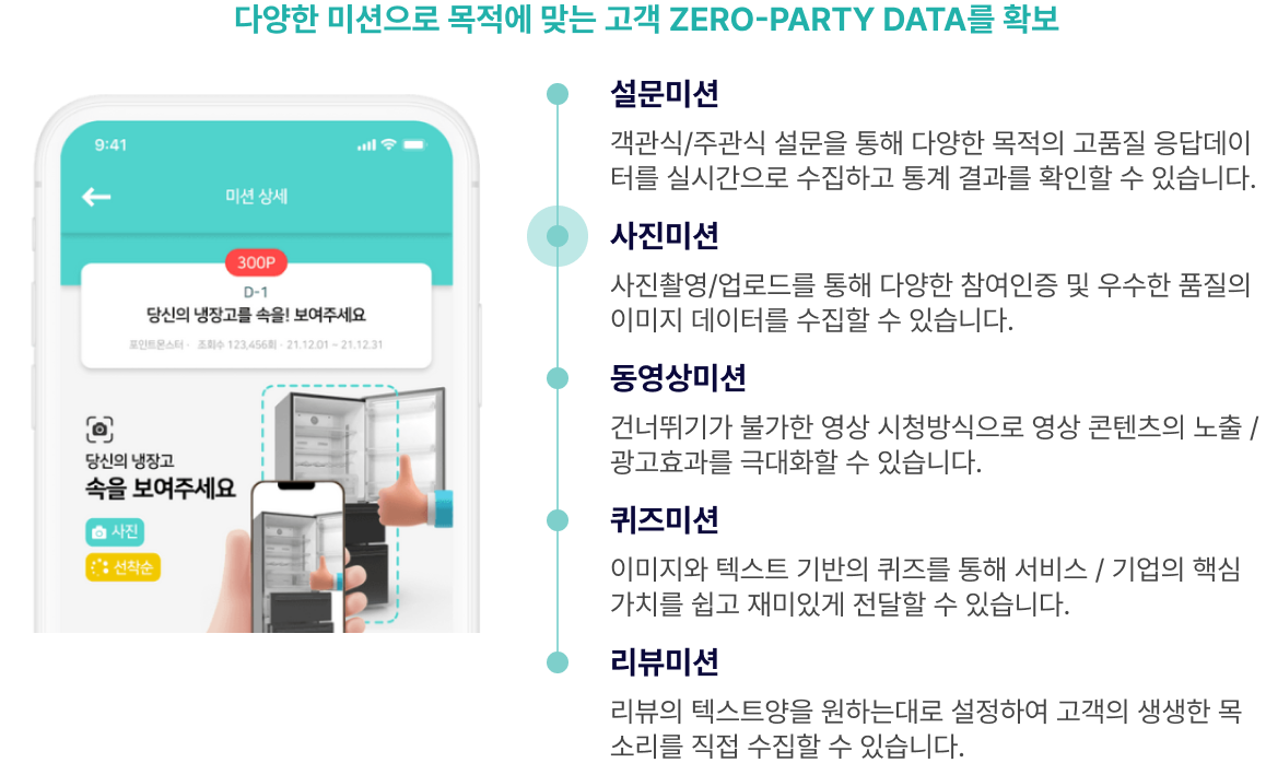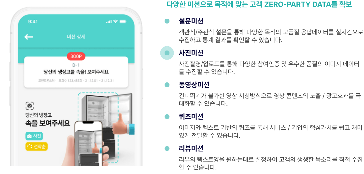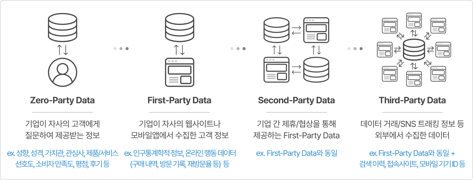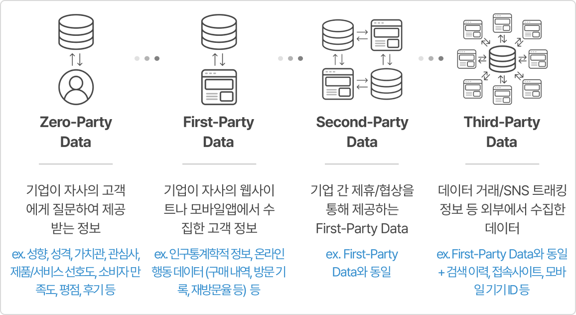 * 제로-파티 데이터 : 고객이 자발적으로 제공하는 리뷰, 선호도, 관심사, 성향, 설문 응답 등의 정형/비정형 데이터로서 행동 데이터만으로 파악 불가한 구매 동기 및 이유 등을 분석할 수 있음