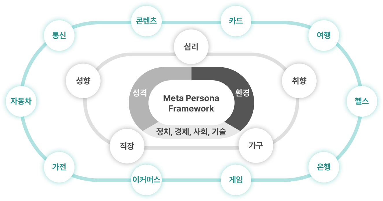 ❶ 메타 페르소나 프레임워크는 고품질의 비금융 소비자 데이터를 수집하기 위한 첫 단계로서, 기업 맞춤형 제로-파티 데이터를 수집하는 역할을 수행합니다. 인간을 이해하기 위한 장기(성격)/중기(환경)/단기(정치·경제·사회·기술)적 관점의 데이터 설계 기본 데모그래픽 정보와 구매 데이터, 선호 브랜드 등 통상적인 데이터에 MPTI 를 적용하여 다각적인 고객 인사이트 제공이 가능하며, 연구와 테스트를 통해 ‘데이타몬드 성향 유형 지표(MPTI, Meta Persona Type Indicator)’를 개발하여 프레임워크에 반영하였습니다(관련 저작권 5개 보유).