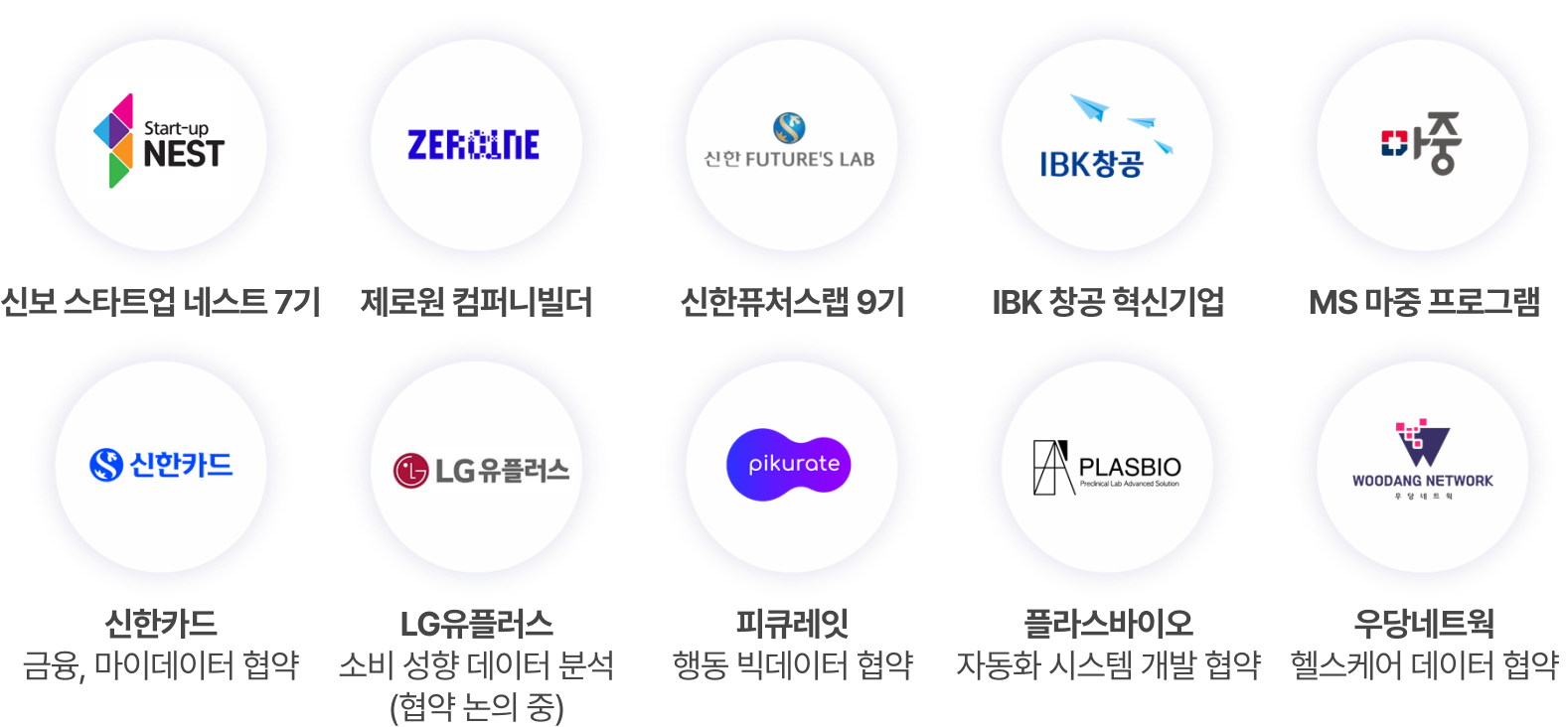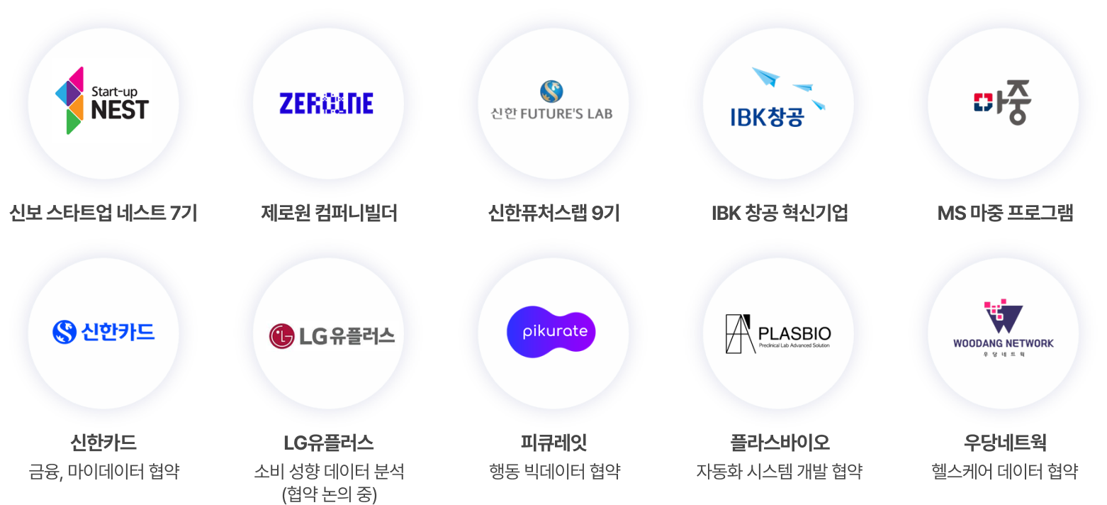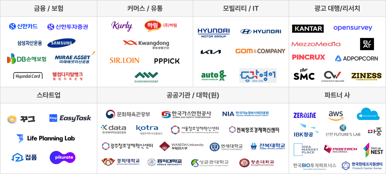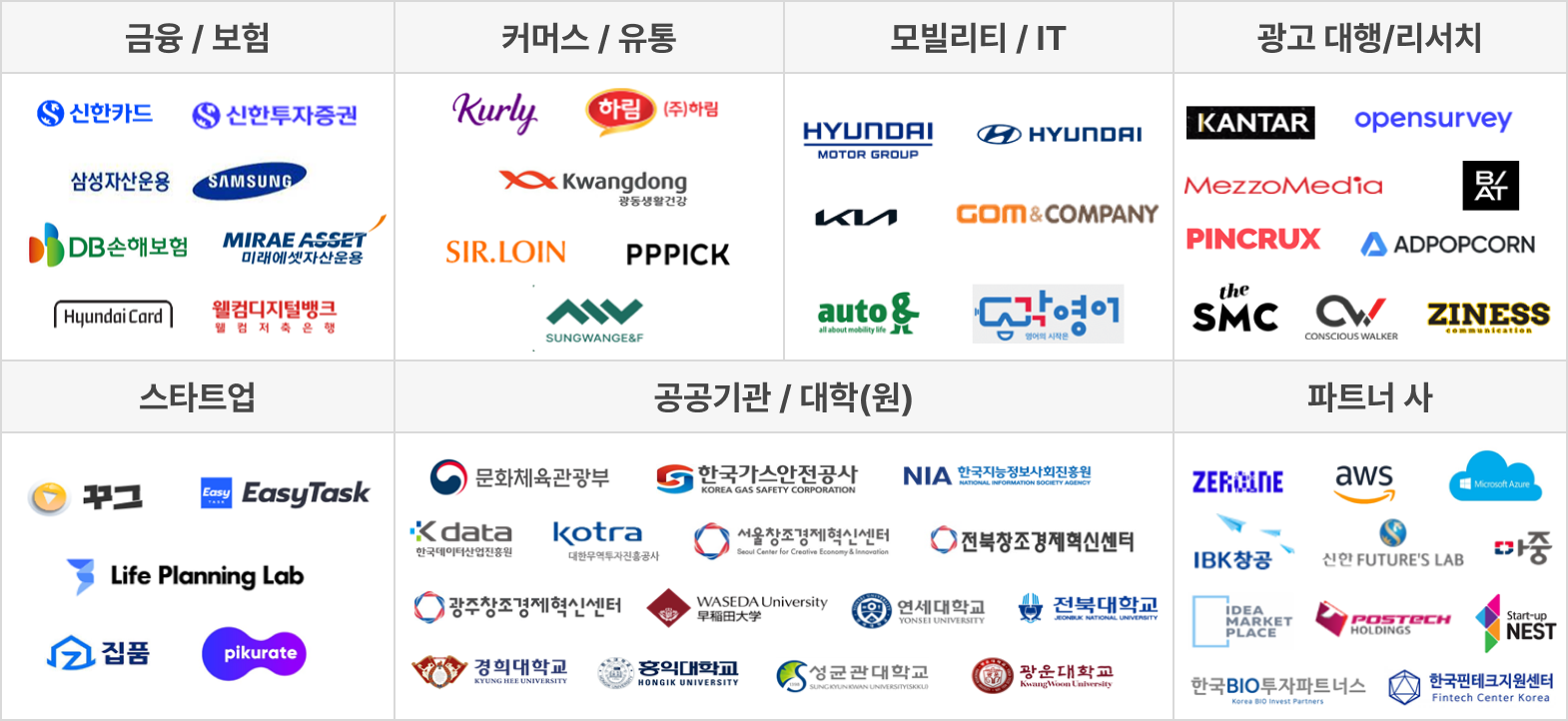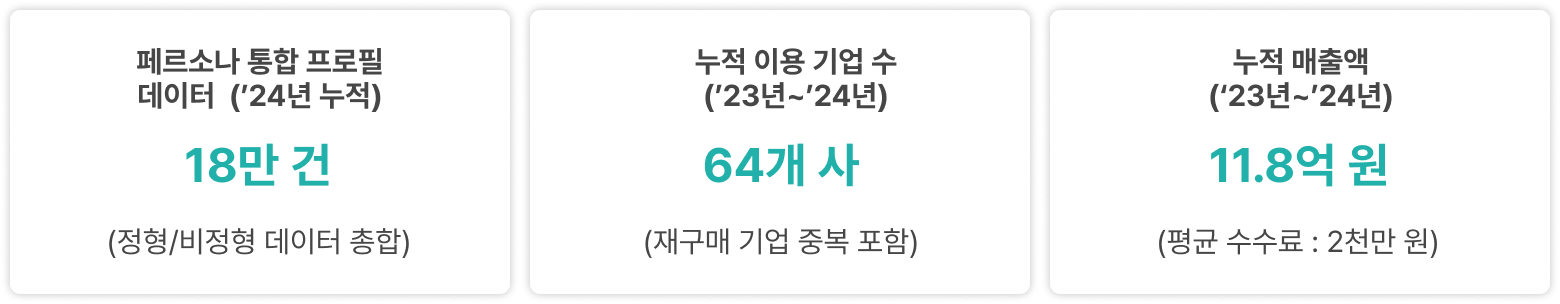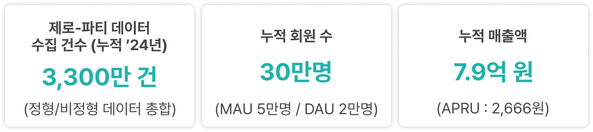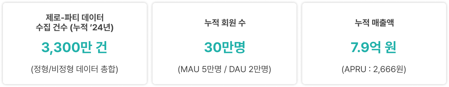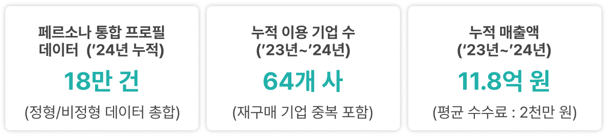 ’25년 3월 현재 B2C 회원수 30만명, 기업 고객 100개사를 확보하고 있으며, 제로-파티 데이터 3,300만건 이상, 페르소나 통합 데이터 18만건 이상을 보유하고 있습니다. 또한 다양한 산업군의 100개 이상의 기업들과의 성공적인 레퍼런스를 만들어가고 있습니다. 특히, 페르소나 파인더 플랫폼의 경우, 신한카드와 마이데이터 및 제로-파티 데이터 협력 체계 구축을 위한 업무협약(MOU)을 체결하고 고객 페르소나 분석, 비금융 제로-파티 데이터 공급을 진행하고 있으며, DB손해보험과 설계사 페르소나 분석 및 코칭 에이전트를 공급하는 PoC를 진행하고 있습니다. 이 외에도 커머스/유통, 모빌리티/IT, 스타트업 등과 고객 데이터 수집 및 페르소나 통합 분석과 데이터 기반 맞춤 마케팅을 진행해오고 있습니다(자세한 내용은 ‘사업성과’ 참조).