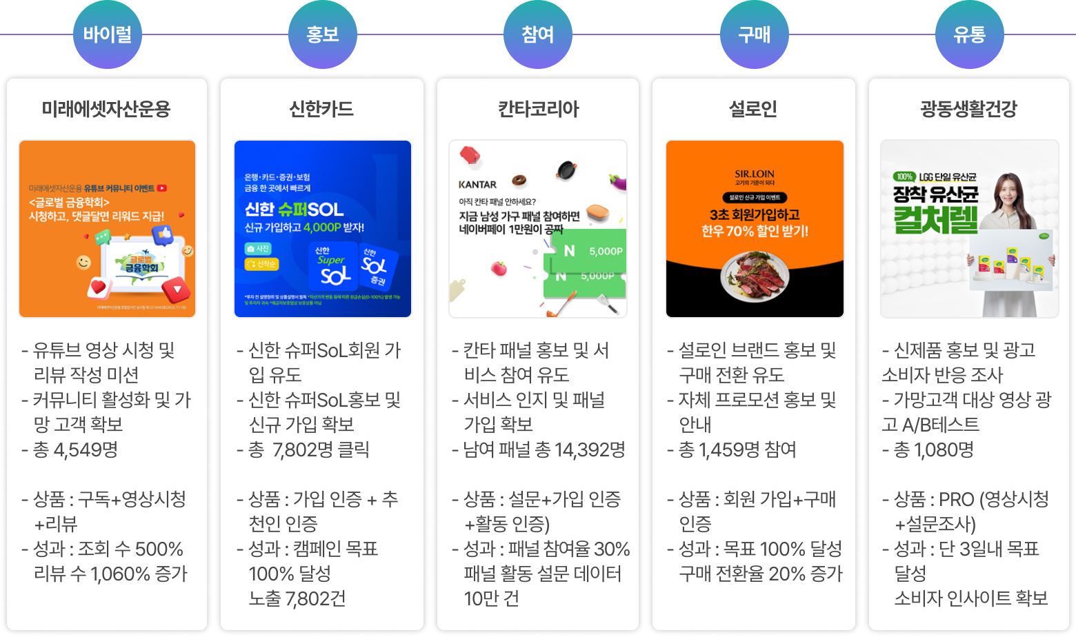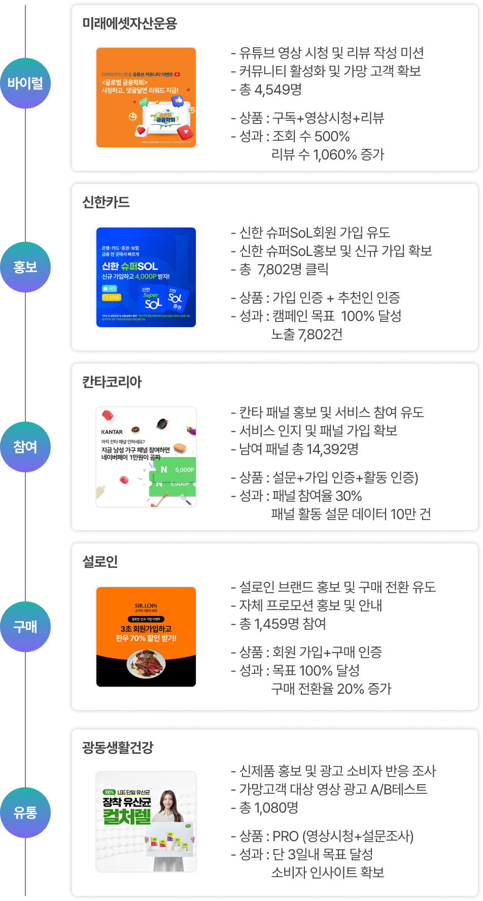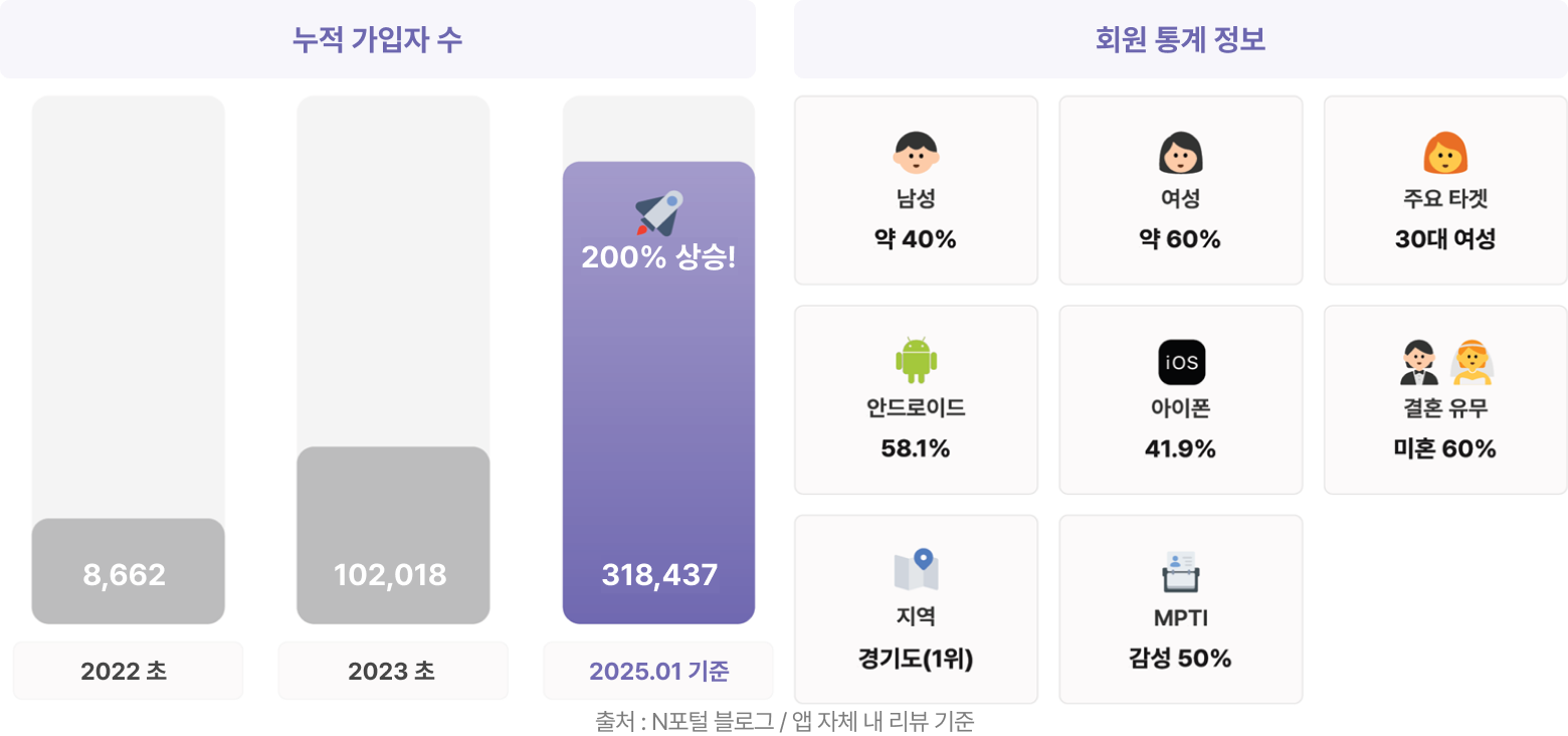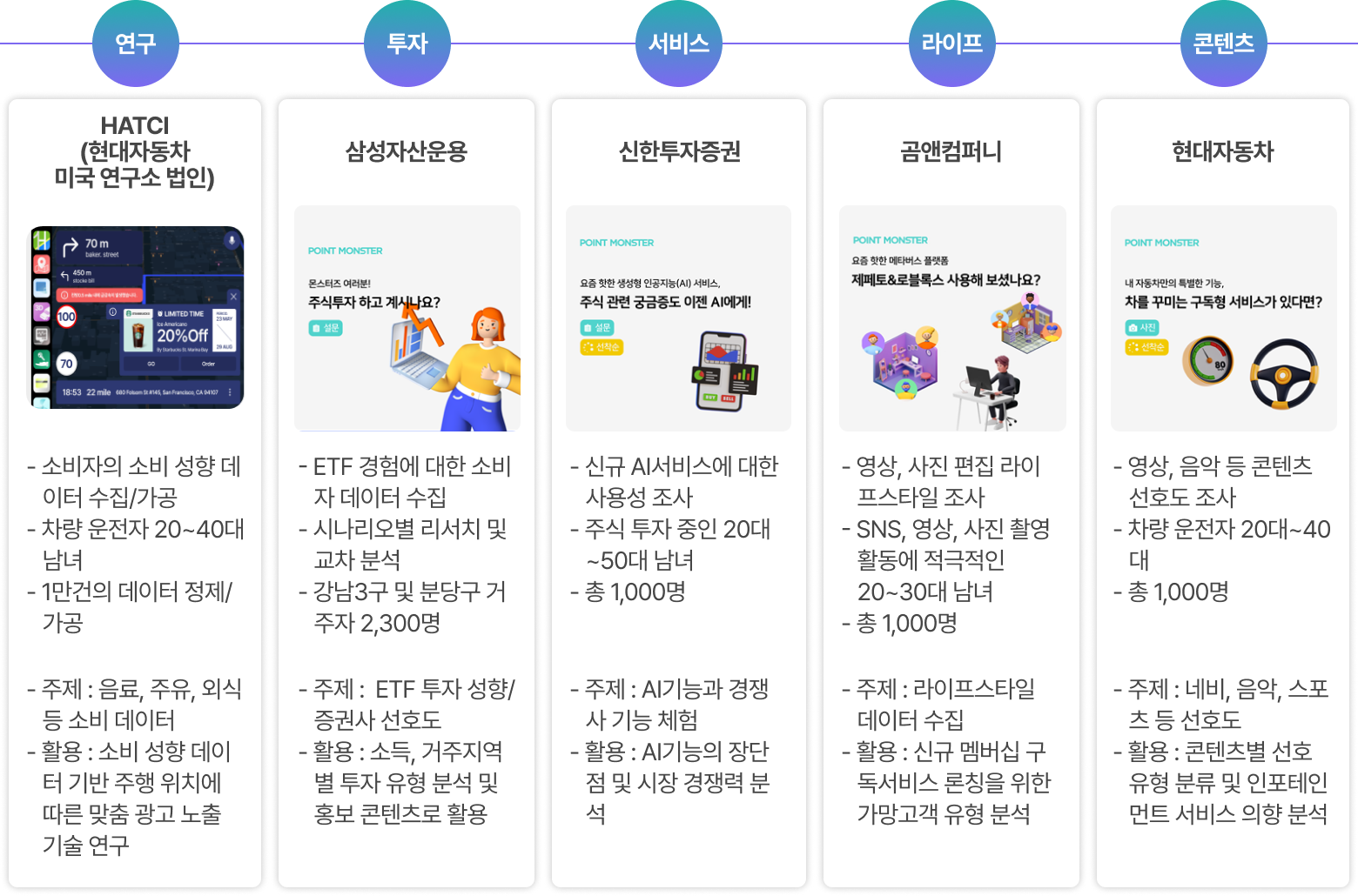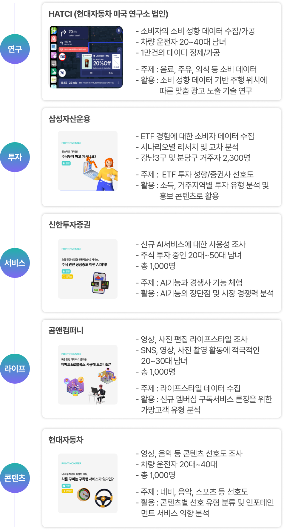 ’25년 3월 현재 B2C 회원수 30만명, 기업 고객 100개사를 확보하고 있으며, 제로-파티 데이터 3,300만건 이상, 페르소나 통합 데이터 18만건 이상을 보유하고 있습니다. 또한 다양한 산업군의 100개 이상의 기업들과의 성공적인 레퍼런스를 만들어가고 있습니다. 특히, 페르소나 파인더 플랫폼의 경우, 신한카드와 마이데이터 및 제로-파티 데이터 협력 체계 구축을 위한 업무협약(MOU)을 체결하고 고객 페르소나 분석, 비금융 제로-파티 데이터 공급을 진행하고 있으며, DB손해보험과 설계사 페르소나 분석 및 코칭 에이전트를 공급하는 PoC를 진행하고 있습니다. 이 외에도 커머스/유통, 모빌리티/IT, 스타트업 등과 고객 데이터 수집 및 페르소나 통합 분석과 데이터 기반 맞춤 마케팅을 진행해오고 있습니다(자세한 내용은 ‘사업성과’ 참조).