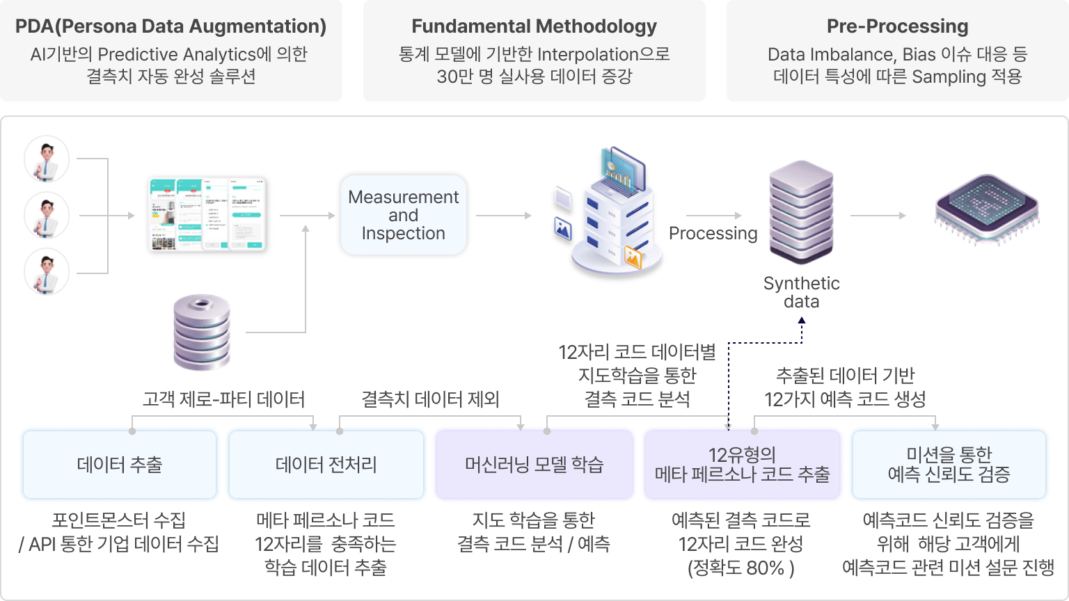 현재 포인트 몬스터와 페르소나 파인더 플랫폼에 가입한 회원은 총 18만 명 규모이며 이들의 프로필 데이터를 모아 정제하고, 이를 통해 AI가 고객 및 각 기업들에게 상품을 추천해줄 수 있다는 것이 특징입니다. 특히 페르소나 파인더는 AI 기반 데이터 결측 보완 솔루션 ‘PDA(Persona Data Augmentation)’으로 AI 기반의 Predictive Analytics에 의해 지도 학습을 통한 결측 코드를 분석·예측하며, 추출된 데이터 기반의 12가지 유형의 메타 페르소나 코드를 추출하여 해당 고객에게 예측코드 관련 미션 설문 진행을 하면서 예측코드 신뢰도를 검증합니다.