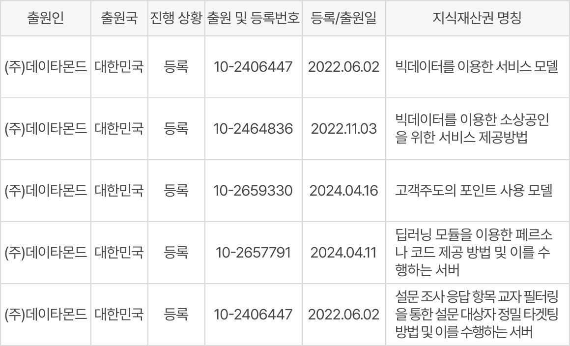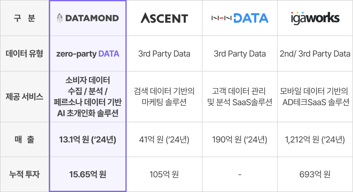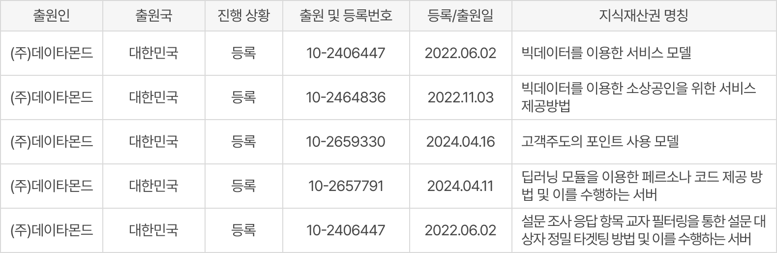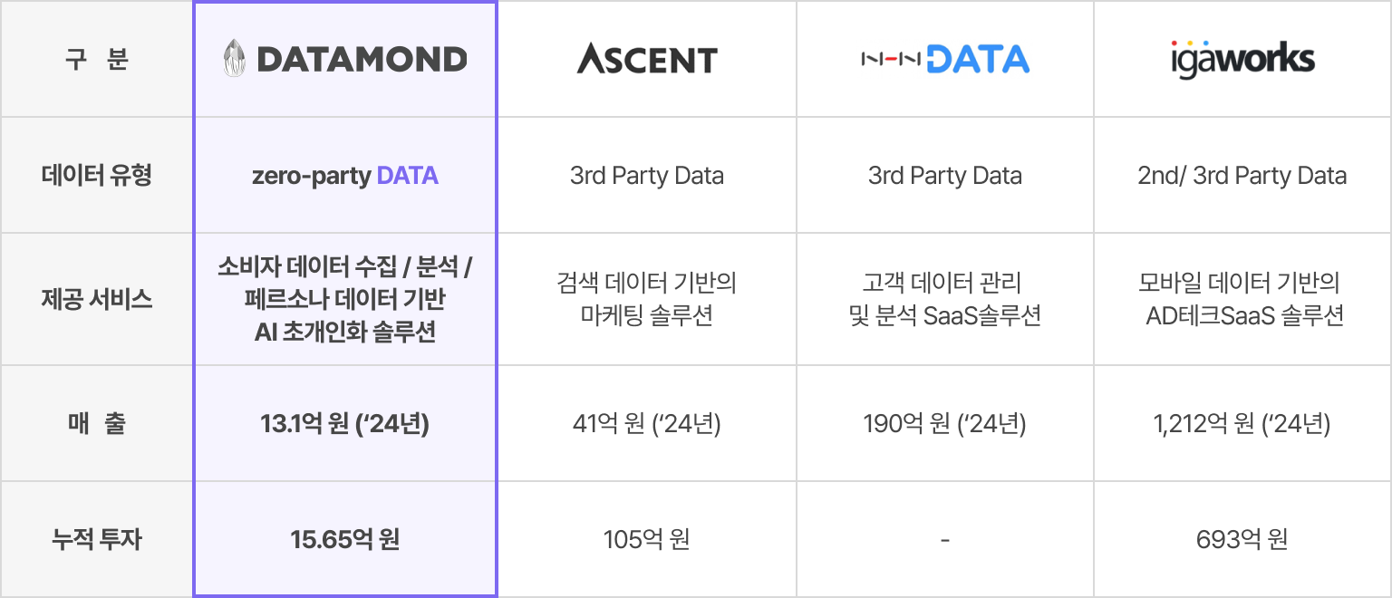 ㈜데이타몬드는 2019년 4월 현대자동차그룹 H-스타트업(사내벤처) 육성프로그램에서 120여 지원팀 중 최종 4개팀에 선정되어 2021년 6월 분사한(현대, 기아 지분 투자) ‘제로-파티 데이터’ 전문 기업입니다. 제로-파티 데이터란 고객이 자발적으로 제공하는 리뷰, 선호도, 관심사, 성향, 설문 응답 등의 정형/비정형 데이터로서 행동 데이터만으로 파악 불가한 구매 동기 및 이유 등의 분석이 가능합니다.