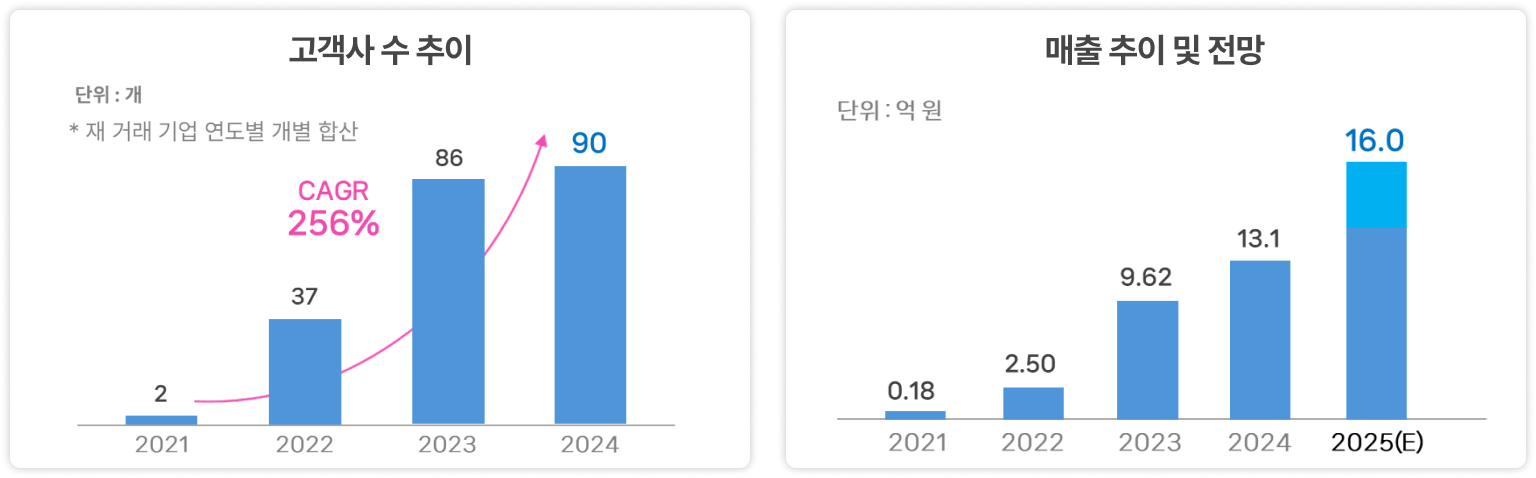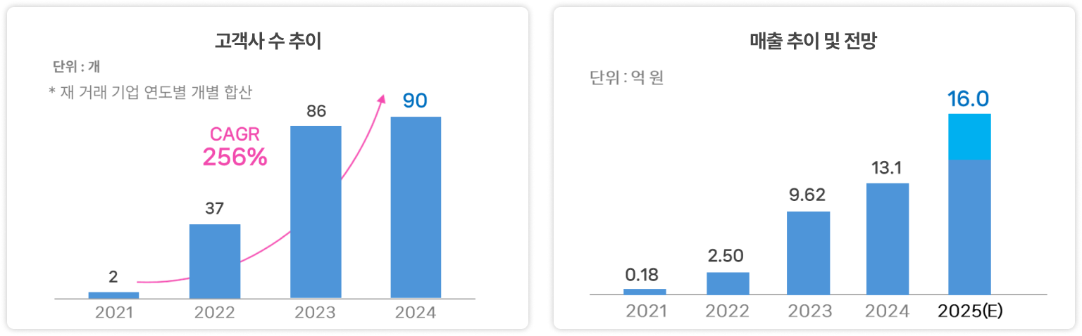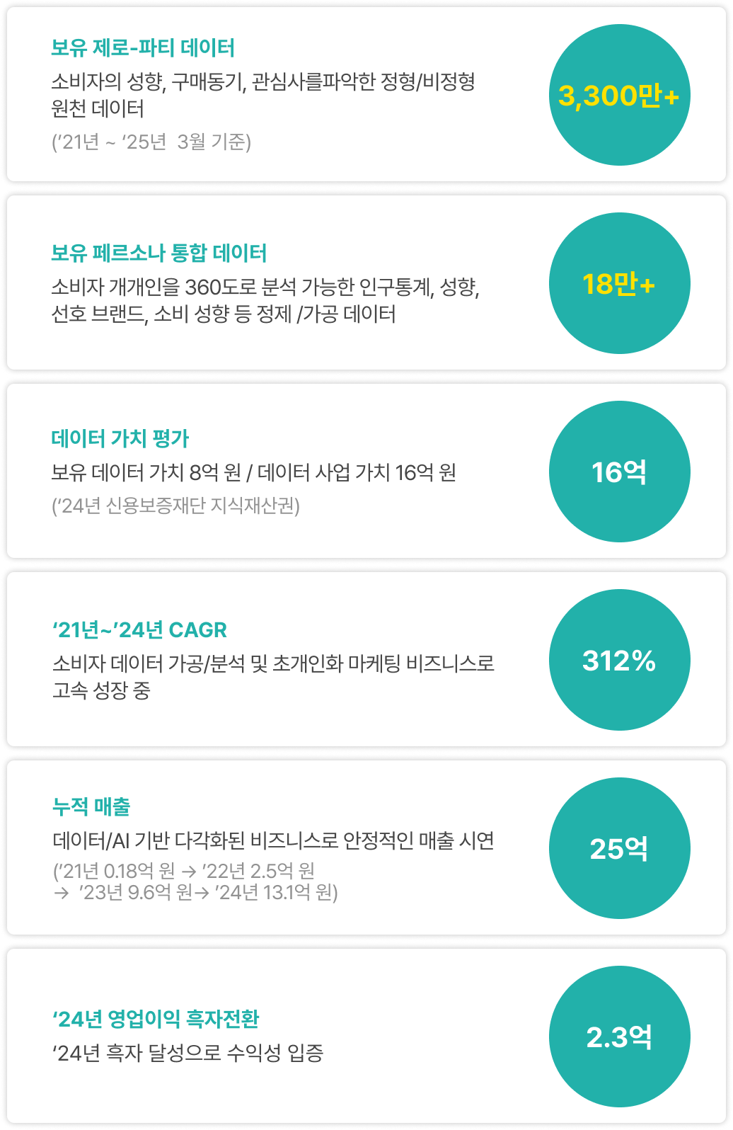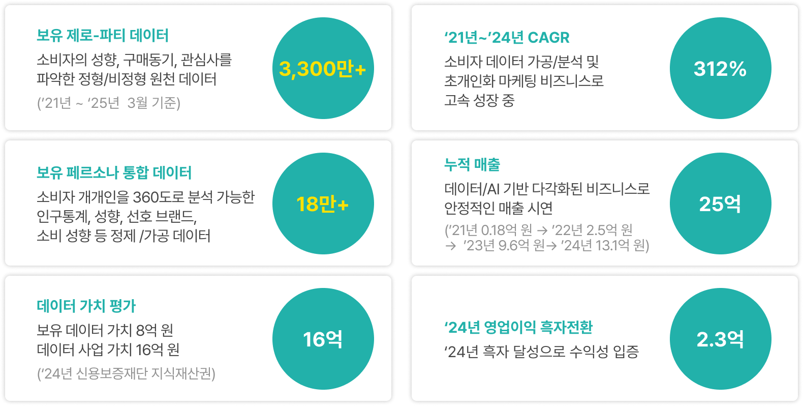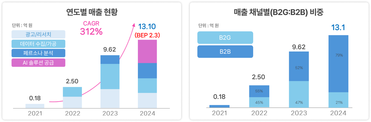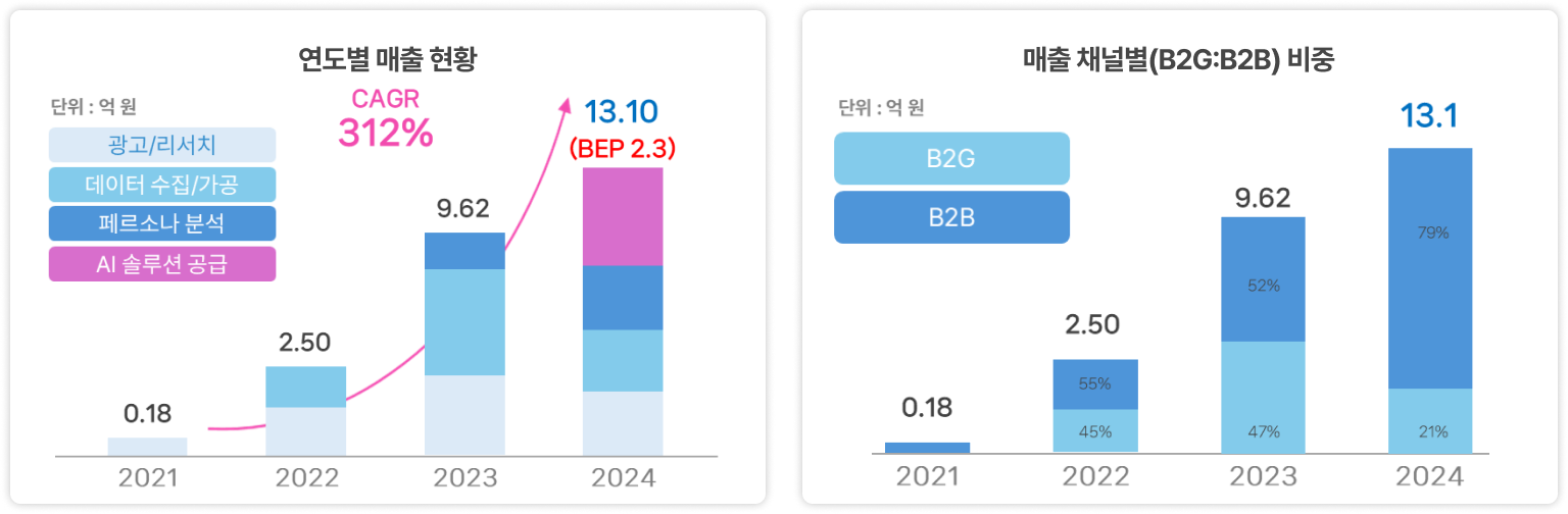 소비자 데이터 가공/분석 및 솔루션 공급 등 비즈니스 다각화를 통해 고객사가 지속적으로 늘어나면서 ’21∼’24년 누적매출 25억을 달성하였습니다(연평균 성장률 312%). 특히 2024년에는 매출 13억원, 영업이익 2.3억으로 흑자전환하면서 수익성과 안정성을 동시에 확보하는 성과를 얻었습니다.