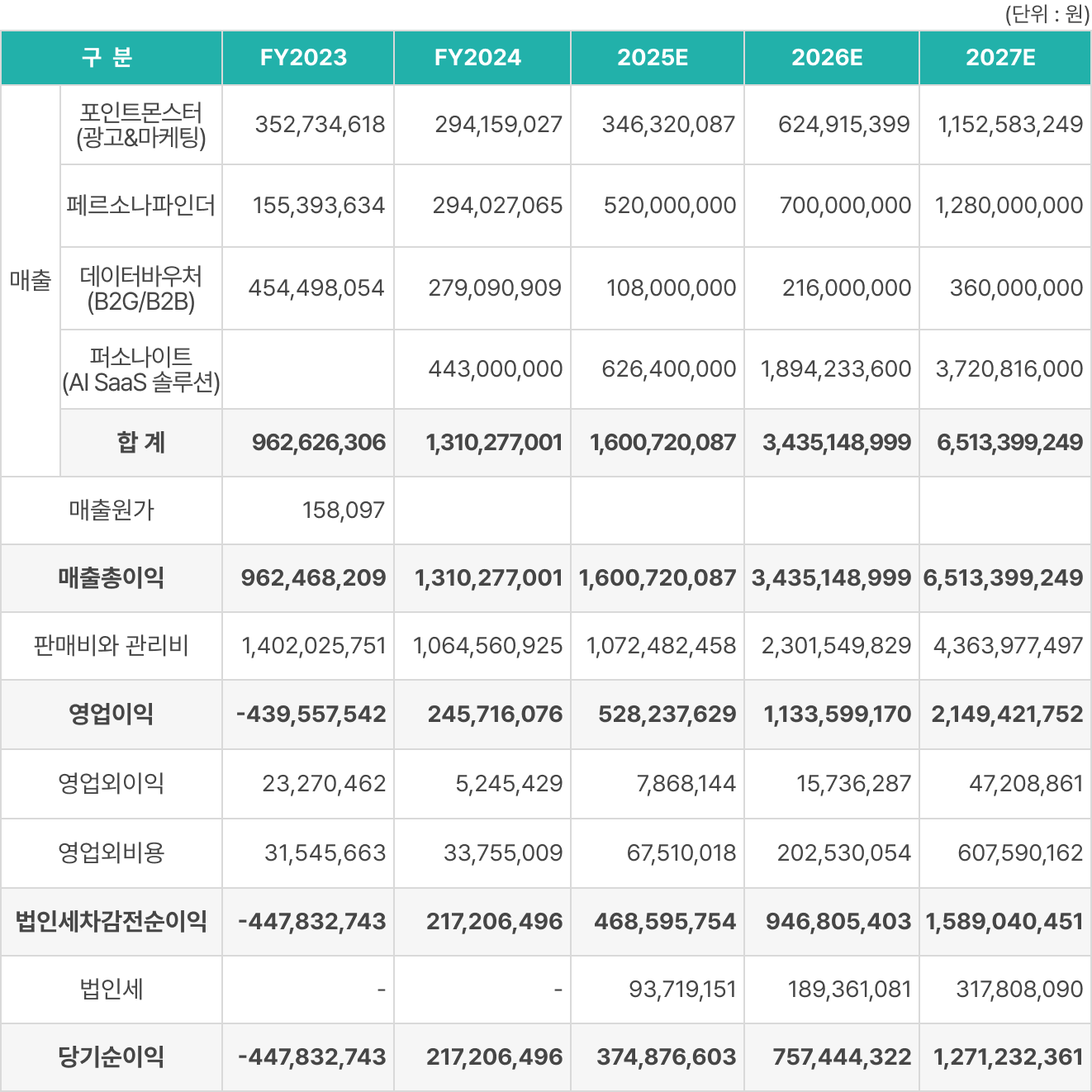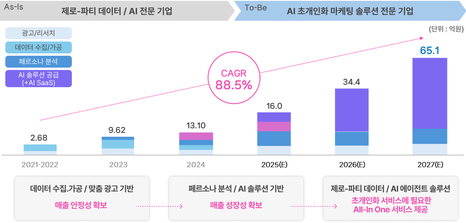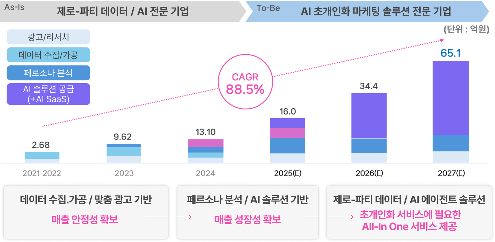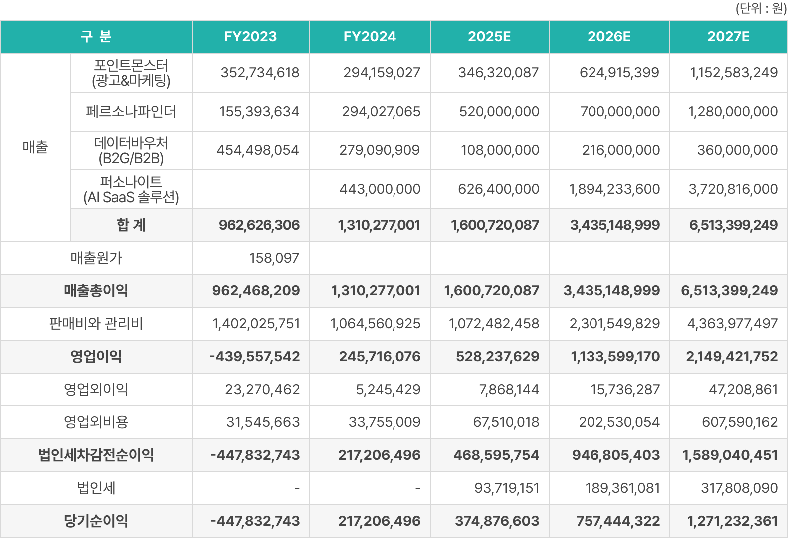 소비자 데이터 가공/분석 및 솔루션 공급 등 비즈니스 다각화를 통해 고객사가 지속적으로 늘어나면서 ’21∼’24년 누적매출 25억을 달성하였습니다(연평균 성장률 312%). 특히 2024년에는 매출 13억원, 영업이익 2.3억으로 흑자전환하면서 수익성과 안정성을 동시에 확보하는 성과를 얻었습니다.