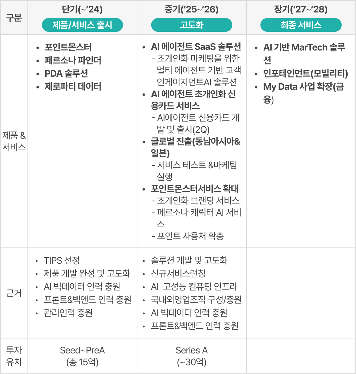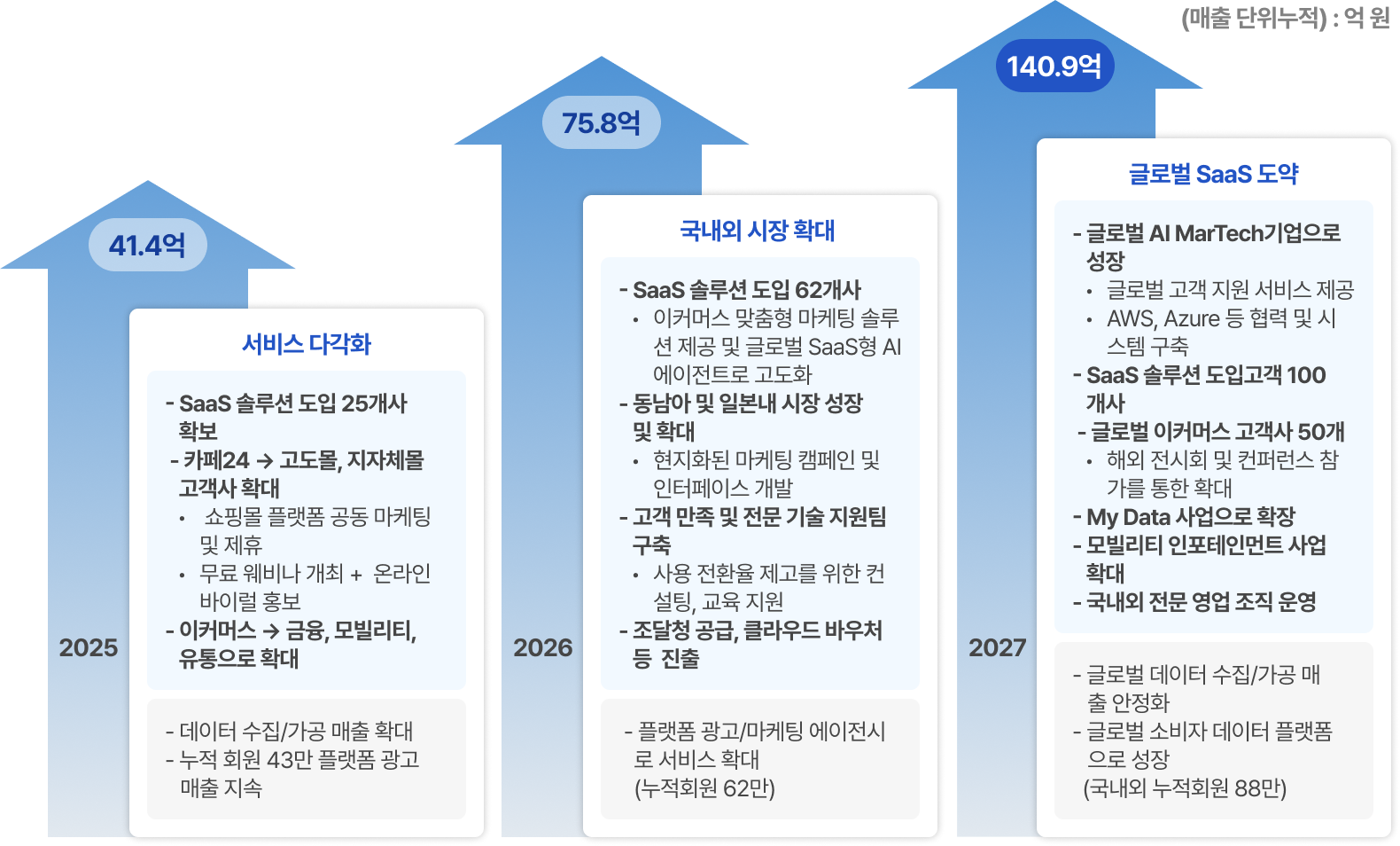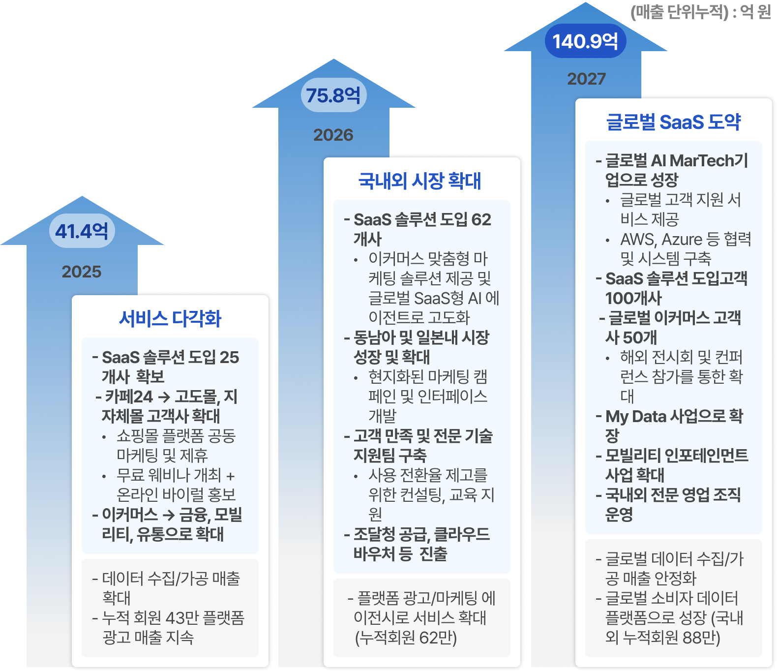 ’27년은 글로벌 고객 지원 서비스 제공을 통해 AI 기반 MarTech 솔루션 기업으로 확장하고, 인포테인먼트(모빌리티)와 My Data(금융) 사업으로 확장하여 글로벌 SaaS 솔루션 기업으로 도약하는 것을 목표로 합니다. 이를 통해 국내·외 누적회원 88만 명, SaaS 솔루션 도입고객 100개, 글로벌 이커머스 고객사 50개 확보하여 글로벌 소비자 데이터 플랫폼으로 성장해갈 것입니다.