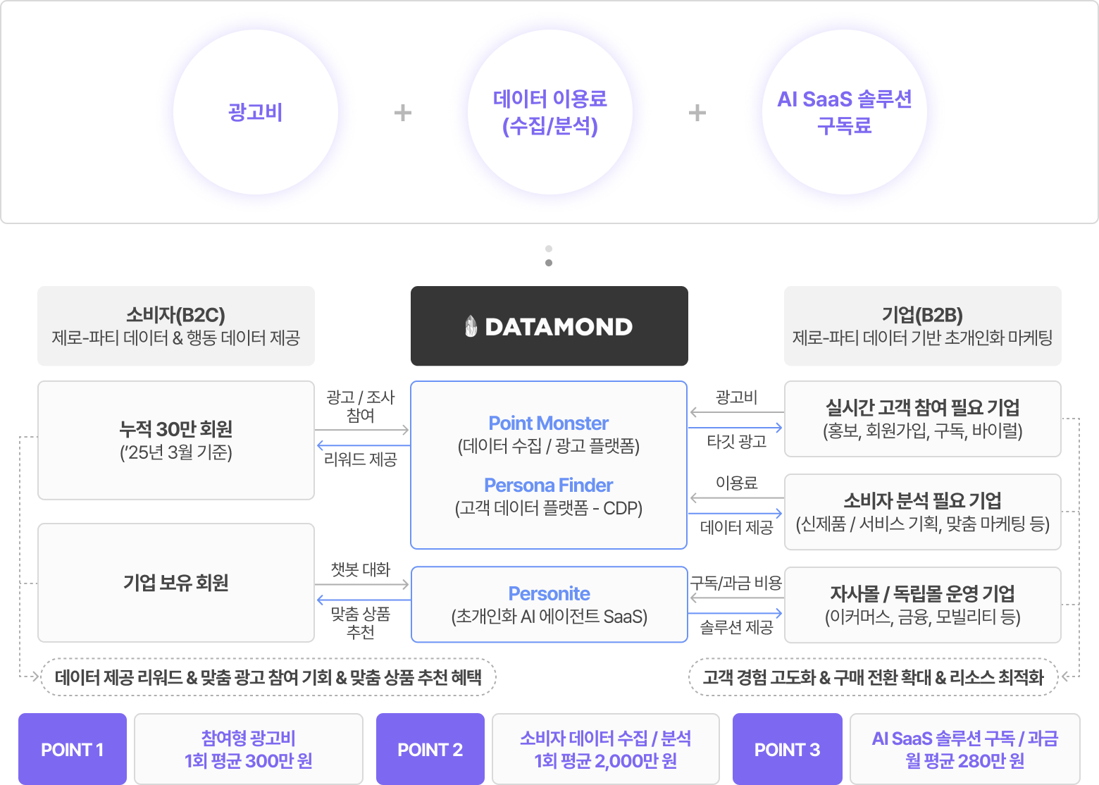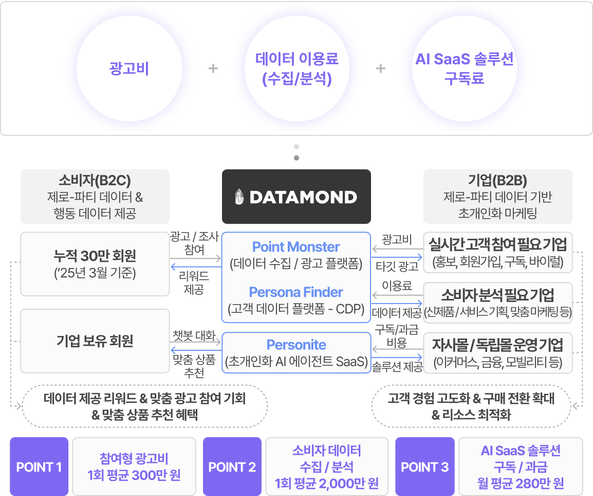 이를 위해 데이타몬드는 취향·성향을 기반으로 데이터를 정의하는 ‘메타 페르소나 프레임워크’, 고객이 자발적으로 제공하는 제로-파티 데이터 플랫폼 ‘포인트 몬스터’, 제로-파티 데이터와 고객 페르소나 프로필을 검색하고 검색 결과를 곧바로 마케팅 캠페인으로 연결할 수 있는 제로-파티 데이터 활용 플랫폼 ‘페르소나 파인더’, 제로-파티 데이터 기반의 생성형 AI 에이전트 마케팅 솔루션 ‘퍼소나이트’로 구성되는 원스톱 제로-파티 데이터 솔루션을 개발·공급하고 있습니다.